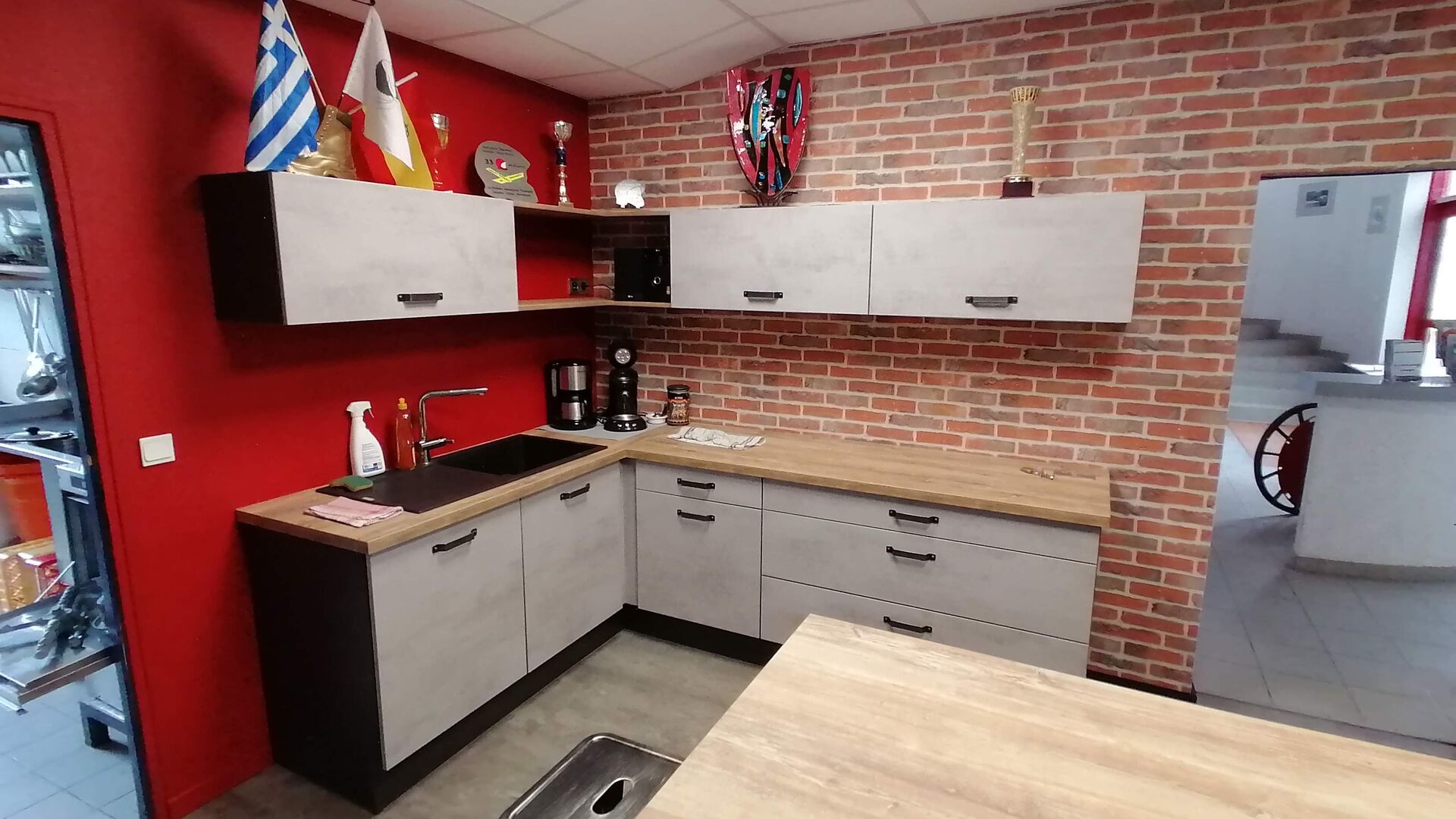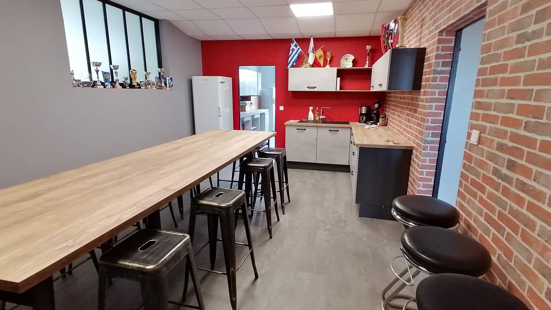 Avec sa décoration soignée de la cuisine à l’espace détente, l’intérieur de ce club house s’apparente à un véritable bar ! Un plan de travail en bois et des façades sombres accompagnent à merveille les murs en briques pour créer une atmosphère cosy, renforcée par des sièges en simili cuir autour des tables de repas, et à l’effet velours dans le coin détente formé autour de la table basse. Les étagères où prennent place les diverses tasses s’inscrivent également dans un esprit industriel que vient souligner la grande horloge murale ronde. Tout a également été prévu pour recevoir le petit électroménager et rendre le nettoyage facile dans cet espace commun très fréquenté, avec un évier à deux bacs en inox et un robinet avec douchette dans l’esprit d’une cuisine professionnelle.