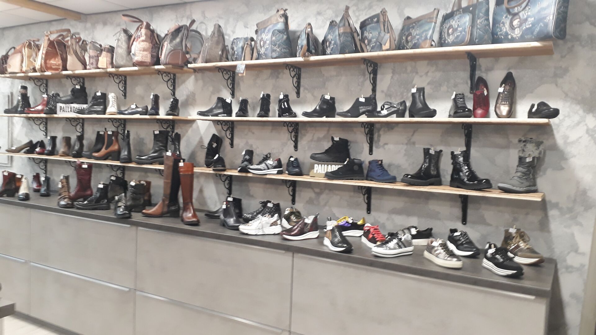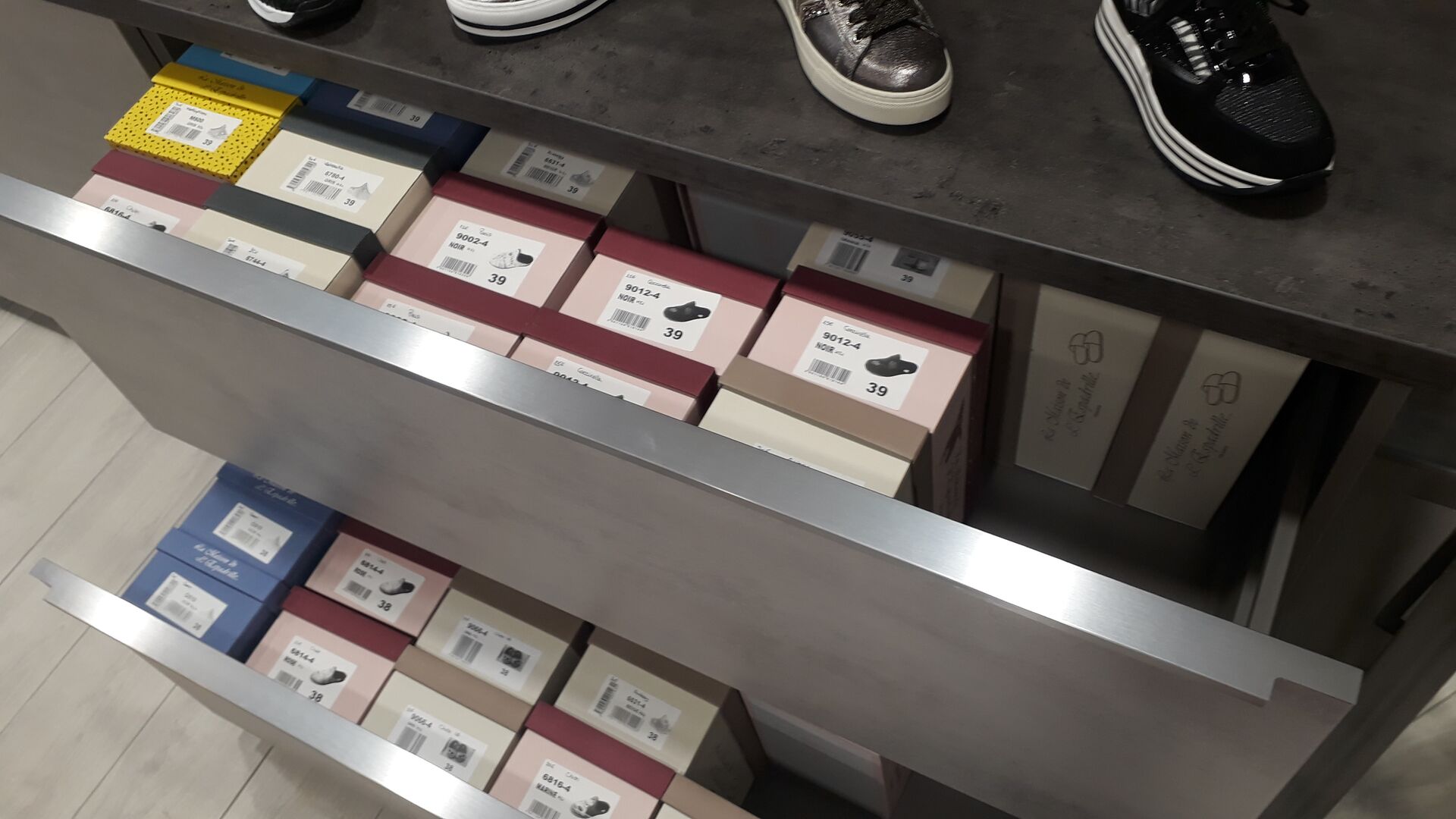 Pour exposer des produits, la simplicité est souvent la meilleure solution. C’est pourquoi ces étagères bois et métal ont été choisies pour aménager l’espace de vente d’un magasin de chaussures. L’esprit chaleureux du bois soutient les chaussures tandis que les équerres en métal noir apportent un effet moderne très raffiné à la structure. En partie basse, place à l’aspect pratique, avec de grands tiroirs qui accueillent les boîtes de chaussures et des poignées qui s’étirent d’un bout à l’autre pour permettre la prise de main sur toute la longueur. Plates et en inox, elles se font discrètes et incarnent un esprit moderne. La couleur du plan de travail s’harmonise avec celle du mur afin de créer un projet homogène tout en élégance.