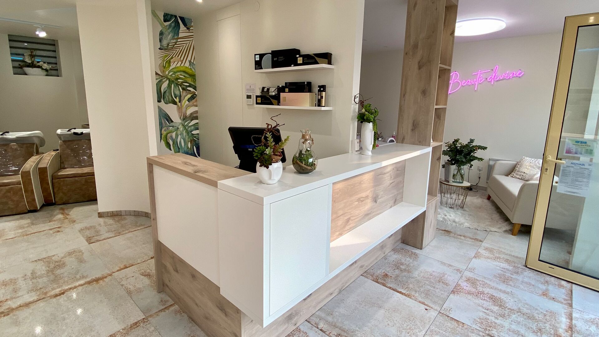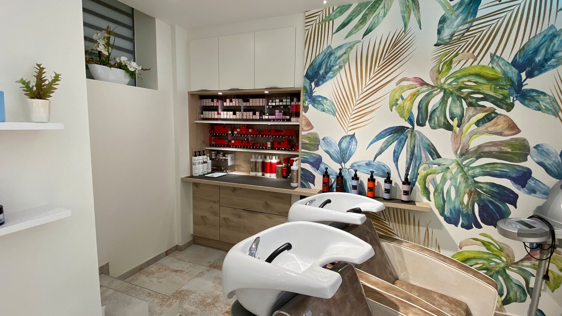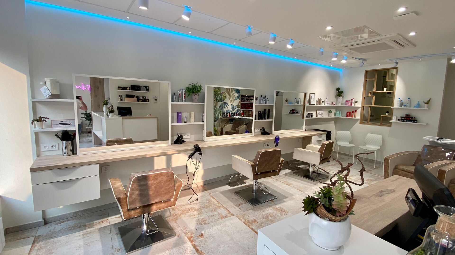 L’aménagement de ce salon de coiffure au dynamisme contemporain passe par le choix d’une association lumineuse entre bois et blanc sur l’ensemble de la pièce. Le bureau d’accueil arbore en outre une forme originale, avec des lignes graphiques qui attirent l’attention tout en conservant des formes sobres, très modernes. Le design de l’espace de coupe repose sur un aménagement tout en finesse faisant alterner miroirs et étagères sur lesquelles prennent place aussi bien des outils et produits professionnels, que des éléments de décoration. À l’entrée, la haute colonne ouverte constitue également un lieu privilégié pour la mise en valeur de la décoration et pour plonger immédiatement le client dans l’ambiance du salon.