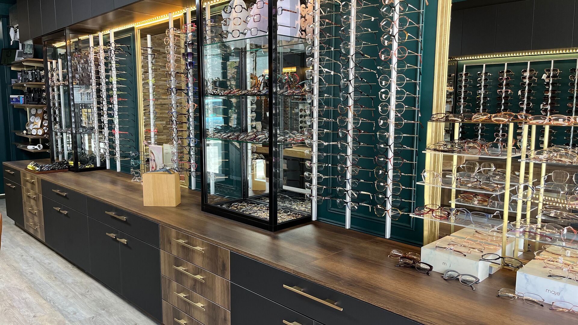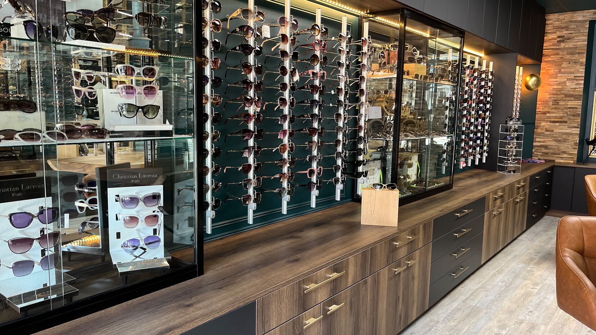 Multiplier les rangements tout en mettant en valeur les lunettes, tel était le défi du projet d’aménagement intérieur de cet opticien. Objectif supplémentaire : répondre à ces attentes en créant un environnement sobre et chic. La solution ? Alterner entre des façades couleur bois et noires, et faire ressortir le tout grâce à des poignées dorées faisant écho à l’éclairage chaud au-dessus des lunettes. Les couleurs sombres créent un espace intime où l’on se sent à l’aise pour choisir ses lunettes, et se démarquent facilement grâce à la mise en lumière soigneusement pensée. Le plan de travail décor bois qui court sur toute la longueur du mur unifie le tout et renforce l’atmosphère chaleureuse du lieu.