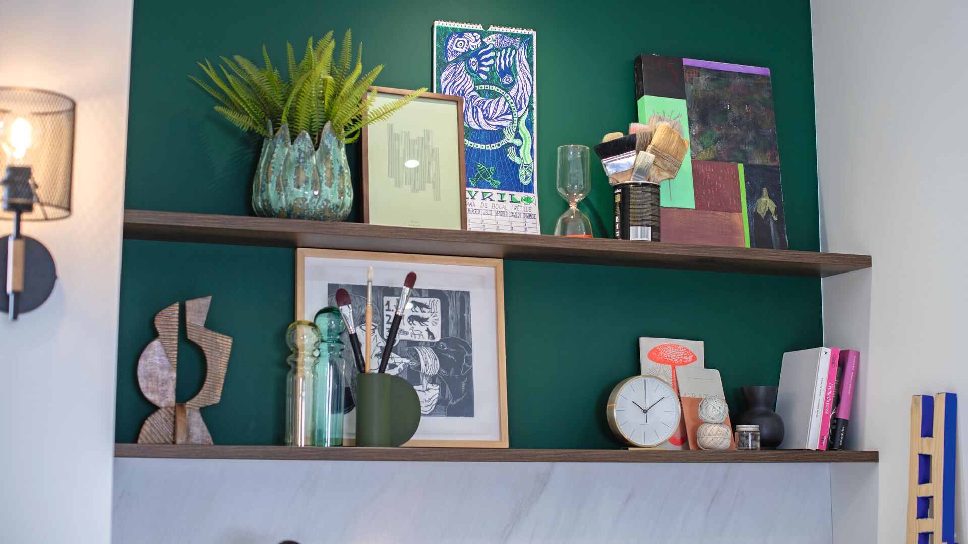 Pour les amateurs de changement, les étagères flottantes, intégrées par exemple à une crédence, représentent la solution idéale pour une décoration murale flexible. Ces supports discrets, véritables caméléons de la décoration intérieure, vous permettent de réarranger cadres, livres et objets de collection à l’envie, sans les contraintes d’une installation permanente. Ainsi, votre espace de vie peut évoluer au gré de vos inspirations en offrant un renouveau constant à votre environnement.