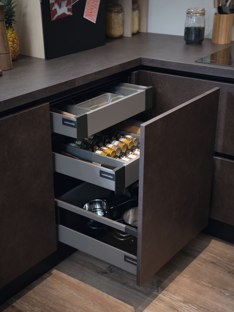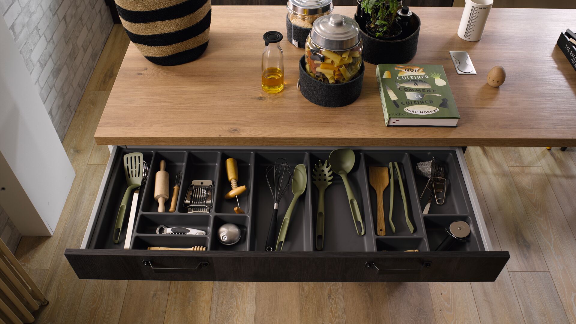 Les tiroirs à l'anglaise présentent une solution élégante pour dissimuler vos ustensiles tout en les gardant facilement accessibles. Derrière une façade discrète se cache un espace de rangement bien organisé. Utilisez le cas échéant des tiroirs équipés de range-couverts et de séparateurs pour organiser l'espace et garder chaque ustensile à sa place.