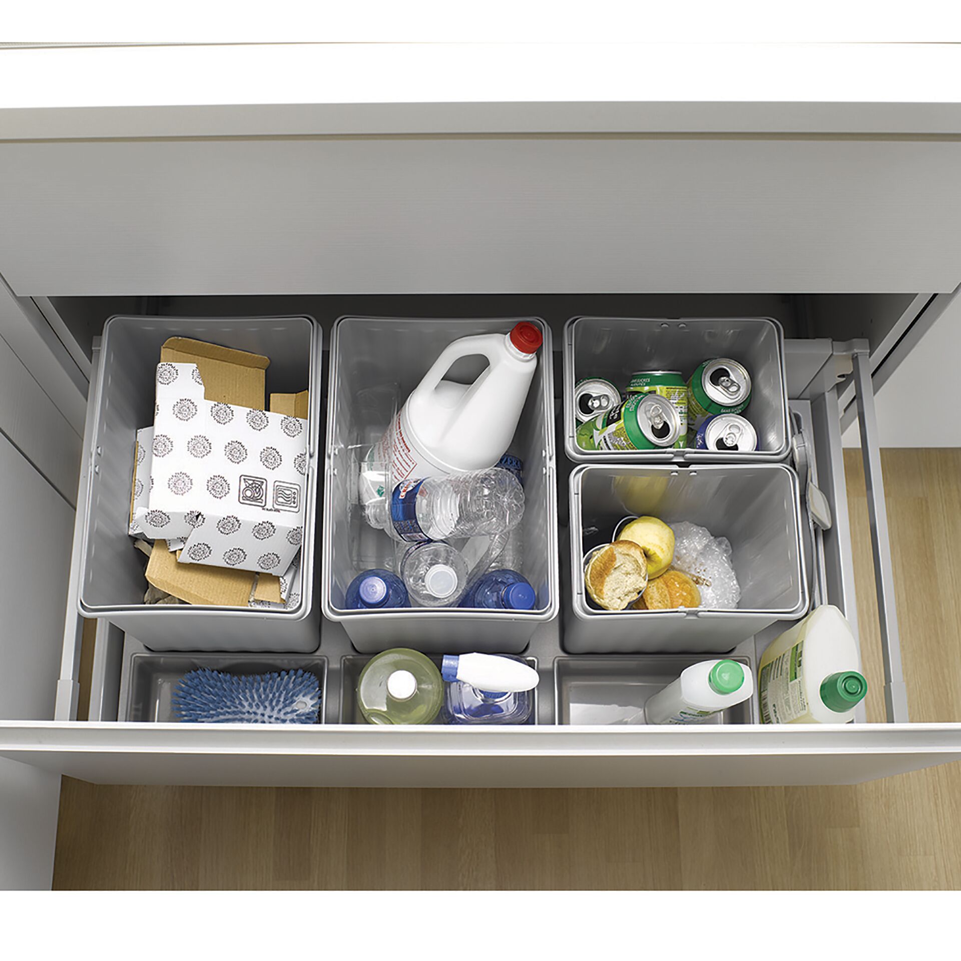 Les poubelles de tri peuvent quant à elles être intégrées dans un tiroir coulissant à proximité du plan de travail pour un accès facile et discret.