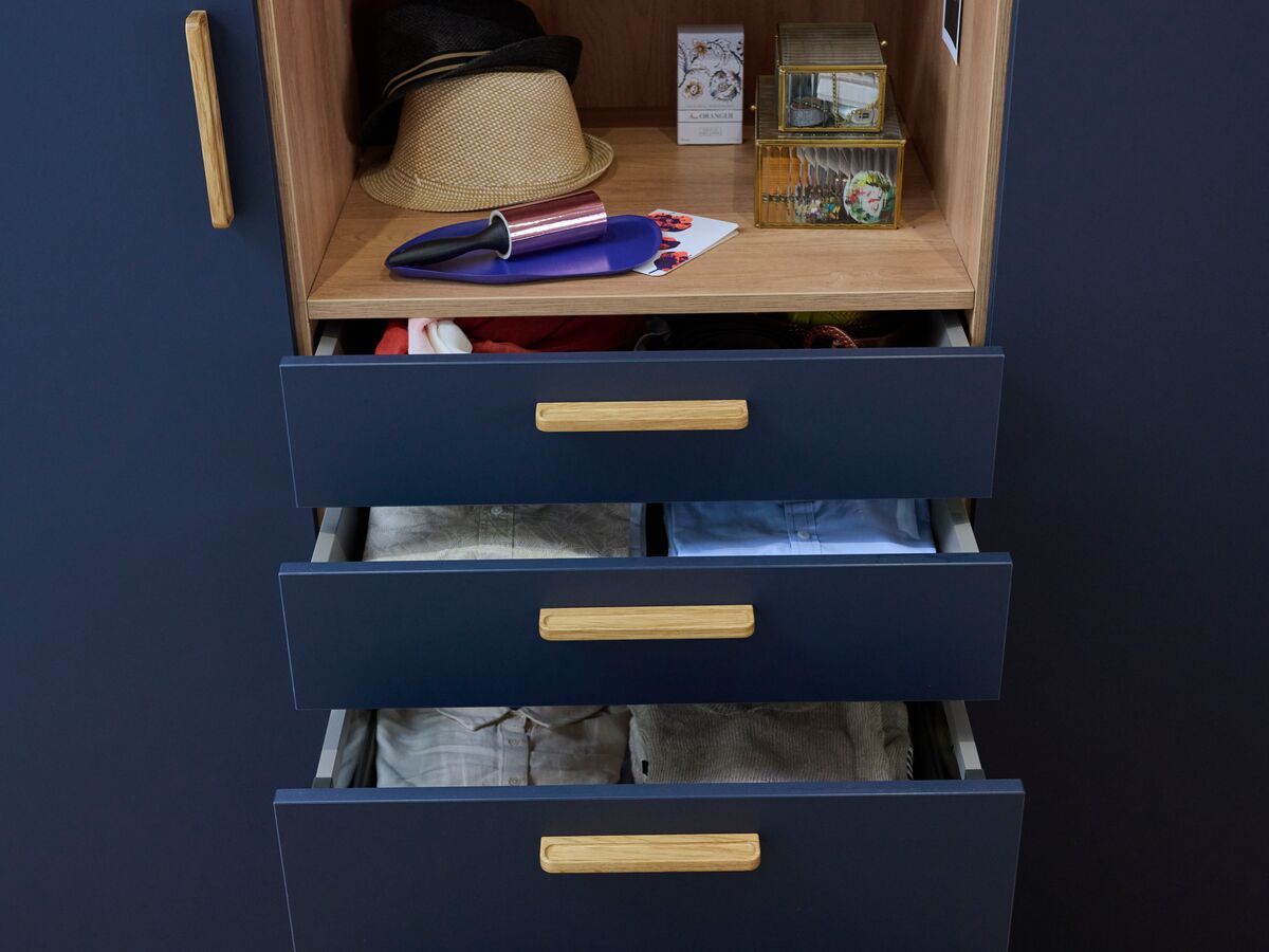 La clé d'un dressing fonctionnel réside dans le choix judicieux des modules de rangement. Privilégiez une organisation verticale qui exploite toute la hauteur disponible. L'aménagement idéal combine des penderies double-hauteur pour vos chemises et vestes courtes, ainsi que des penderies longues dédiées aux robes et manteaux. Pour optimiser le rangement de vos pulls et t-shirts, pensez la hauteur de vos étagères suivant la taille de vos piles de vêtements. Concernant les petits accessoires et sous-vêtements, trois à quatre tiroirs suffisent généralement pour un rangement efficace.