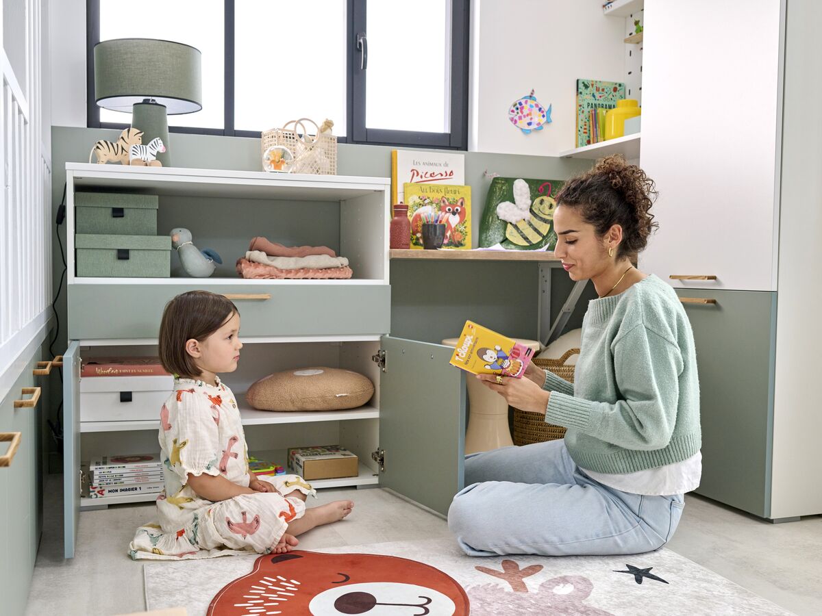 Les premières années, votre bureau évolutif peut se transformer en un coin lecture chaleureux. Un plan de travail posé sur un meuble bas de rangement crée une banquette confortable, idéale pour les moments de lecture. Cette configuration permet à votre enfant de s'approprier son espace tout en développant son goût pour les livres. Plus tard, le même agencement s'adaptera parfaitement aux sessions de devoirs et aux activités créatives.