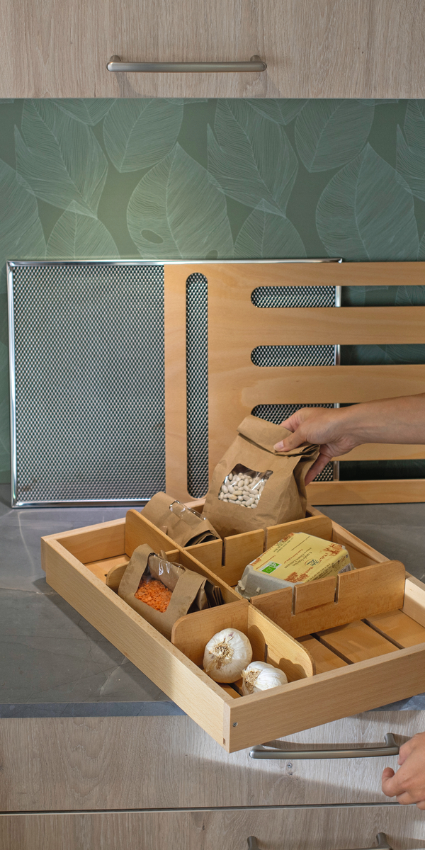 Là, vos fruits, légumes et œufs ont vraiment leur place. Équipé de tiroirs en bois avec des fonds aérés fixes, le légumier se ferme pour disparaître complètement dans votre cuisine.