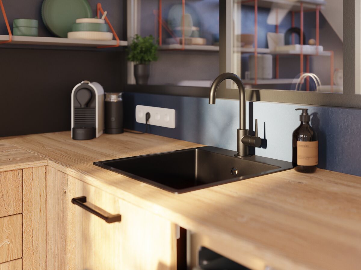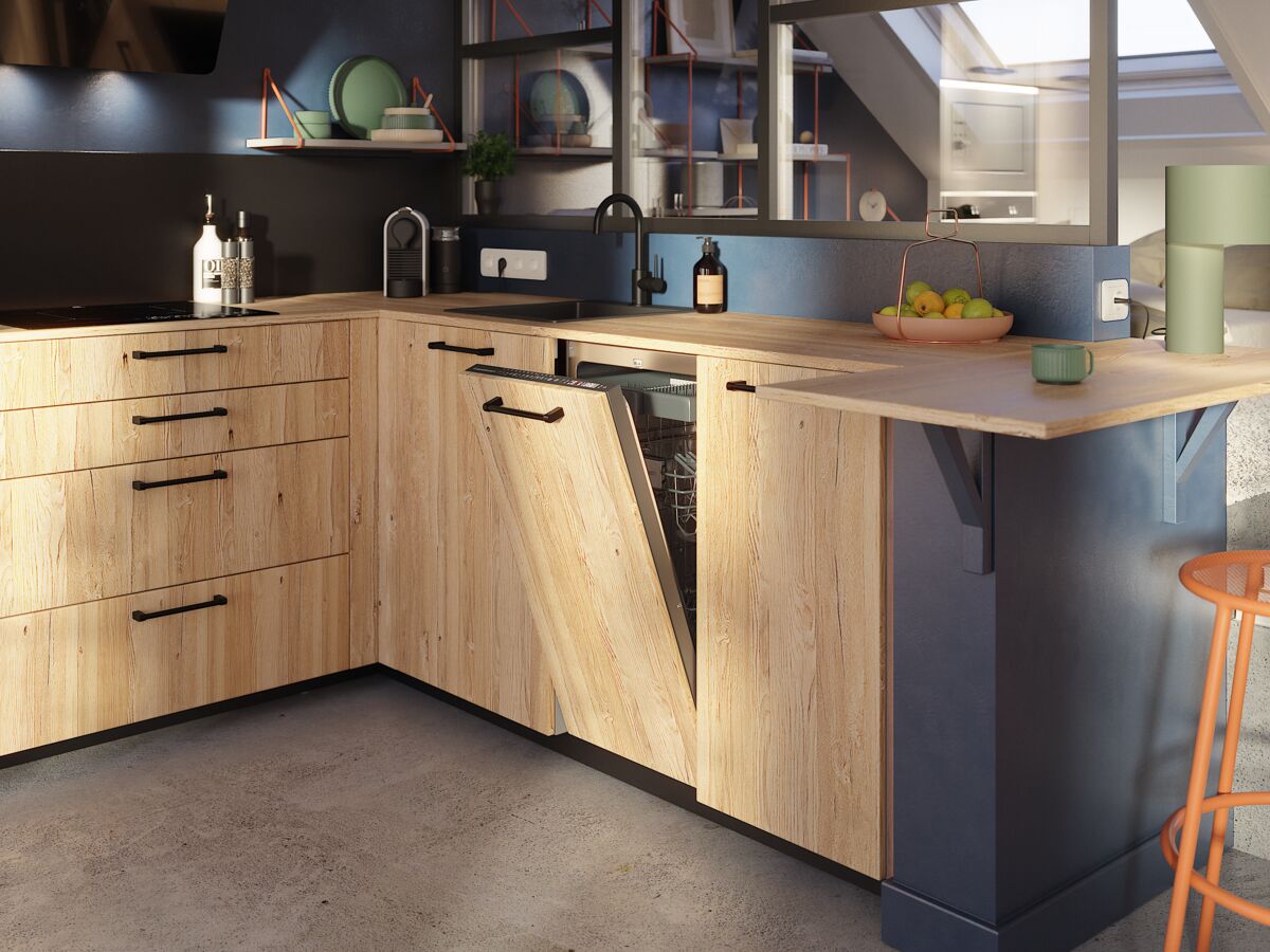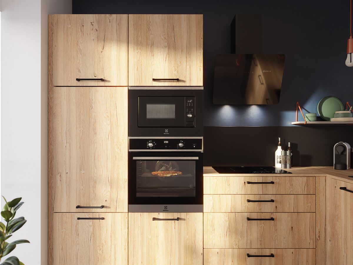 Côté style, cette cuisine offre le mix parfait entre la modernité de ses équipements noirs et l’aspect chaleureux des façades en bois. Sa teinte plutôt sombre et ses nervures marquées, également disponibles pour le plan de travail, impriment à la pièce un caractère fort mais convivial, qu’on ne peut manquer de remarquer, mais dans lequel il fait bon vivre. Un équilibre idéal dans un petit appartement, où la cuisine constitue la pièce à vivre !