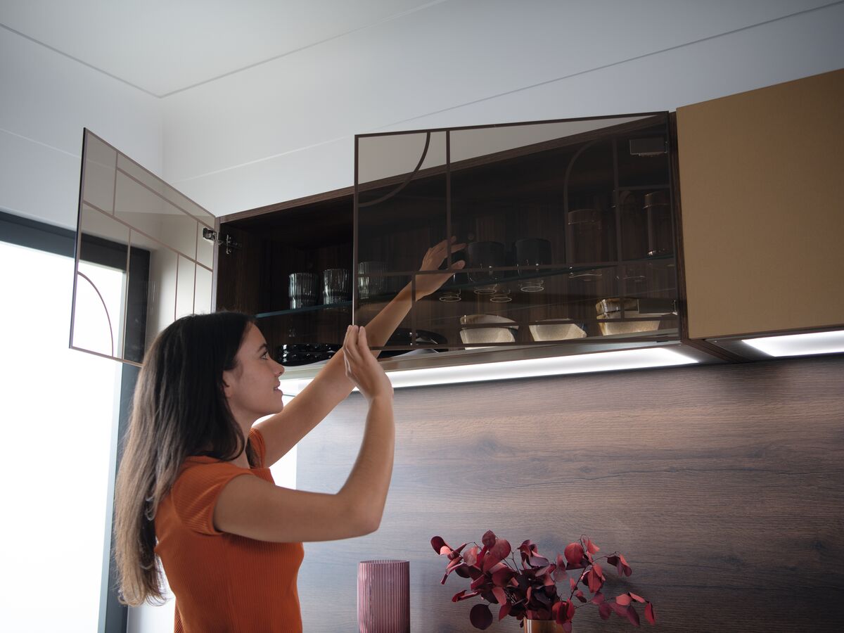 Ornée de pièces iconiques, comme le grand lustre et ses étagères carrées, cette cuisine Trend Chêne moka valorise le fait maison, l’artisanat et les objets qui s’offrent une deuxième vie. La crédence aux larges fleurs colorées se marie à merveille avec le bois foncé de l’îlot central et du plan de travail. On aime aussi le liseré doré qui orne les hauts vitrés, ainsi que l’alliance réussie entre les touches de gold, le doré et le bleu.