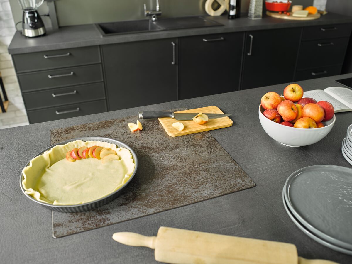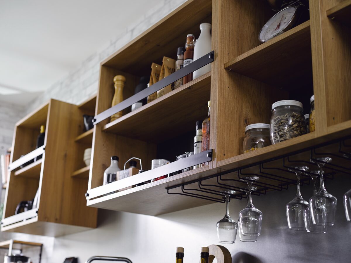 Oui, vous êtes bien dans une cuisine, mais aux allures d'ancien atelier ! Tout est fonctionnel et à portée de main dans ce mélange de fer vieilli et de bois coloris chêne honey. La nouvelle façade laque métal renforce encore le côté indus de cet atelier reconverti. C'est vrai, l'îlot central a un côté établi indéniable avec son piètement Careta métallique noir, ses rangements ouverts, ainsi que ses étagères en bois qui pourraient aussi bien accueillir des outils que des ustensiles de cuisine. Oui, les verres suspendus aux supports semblent être placés sur une chaîne de montage. Il suffirait presque d'actionner la poignée en fer vieilli pour tout mettre en mouvement. Mais il y a une grande différence : dans cette Cuisinella, on ne fabrique pas de produits manufacturés, mais de bons petits plats maison et on partage plutôt des apéritifs conviviaux que des heures de travail. L'insert en céramique sur le plan de travail, par exemple, n'est pas là que pour être joli, il s'agit d'un véritable support fonctionnel pour renforcer le plan de travail lors de la préparation des repas.