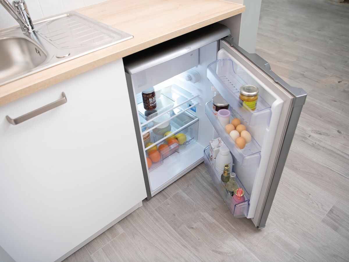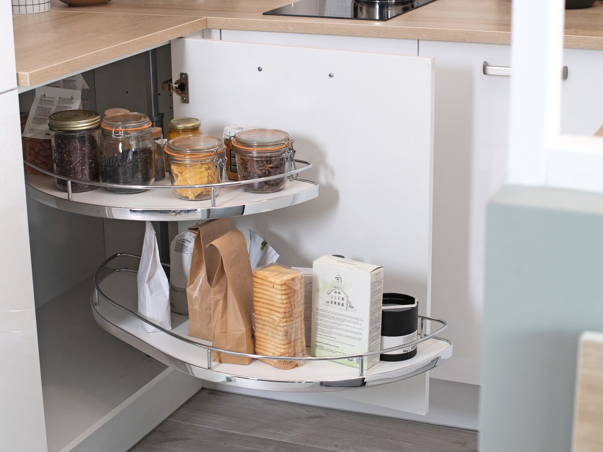 À cela s'ajoute une étagère ouverte, fixée en hauteur au-dessus du plan de travail, pour y poser les divers ustensiles de cuisine et condiments. Cet espace dispose également d'une armoire de rangement pouvant abriter toute la vaisselle. Pour parachever l'ensemble, cette cuisine en U petite surface est proposée avec un réfrigérateur sous plan de travail conçu pour optimiser au maximum cet espace si précieux !