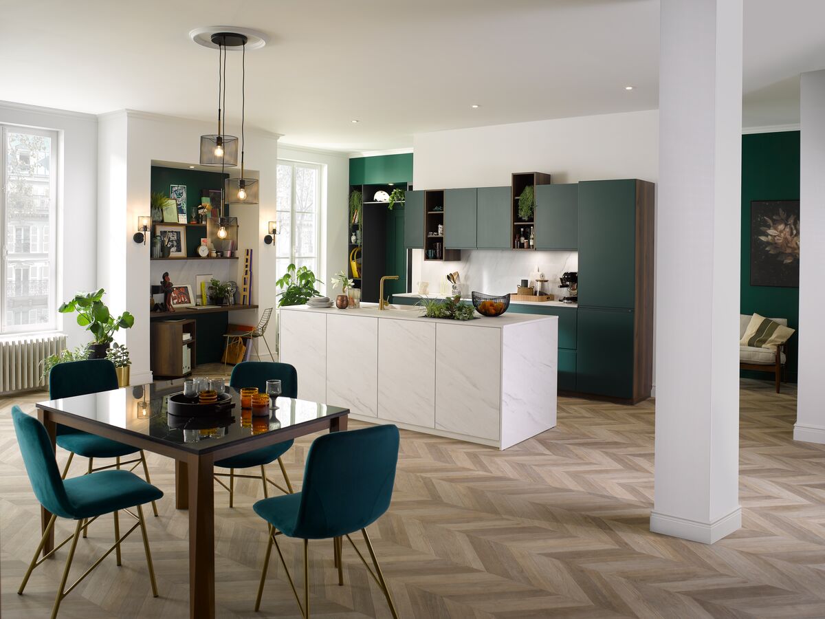 Idéale pour un appartement ancien de caractère disposant d'une pièce de vie relativement grande, la cuisine ouverte sur salon de style Fusion folk séduira à coup sûr avec son caractère arty affirmé. Ses coloris vert tendance et son plan de travail effet marbre enjoliveront l'espace avec goût et modernité.