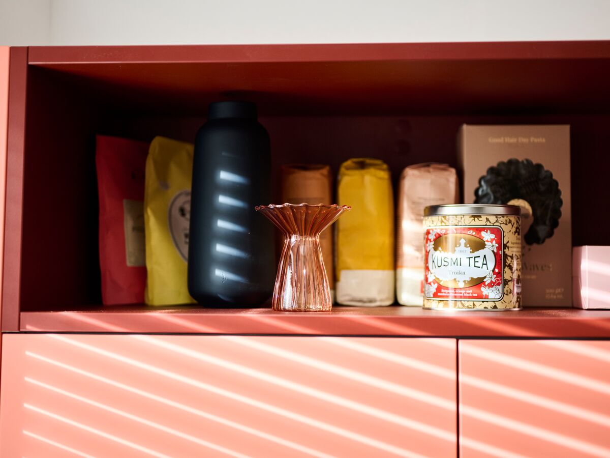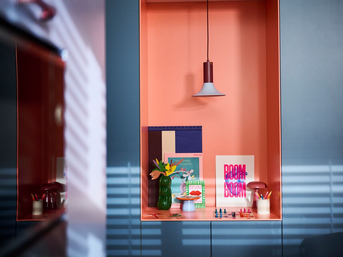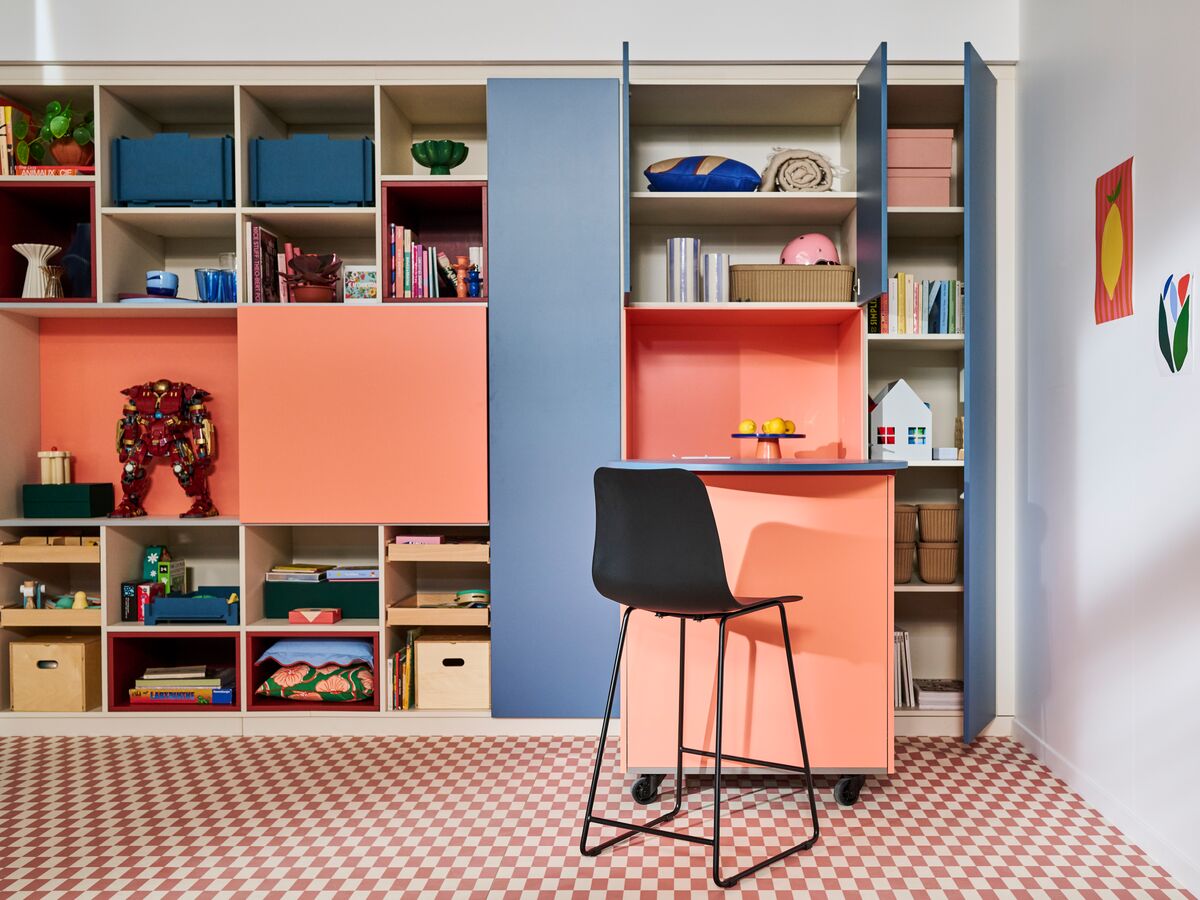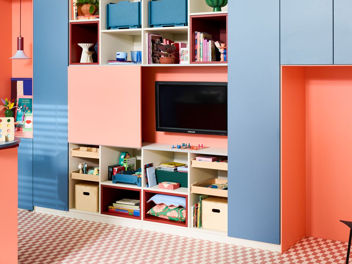 Au-delà de son esthétique audacieuse, cette bibliothèque orange et bleue se distingue par sa modularité. Ses étagères sur-mesure permettent d’exposer livres, objets, vinyles ou pièces décoratives sans jamais compromettre l’harmonie visuelle.