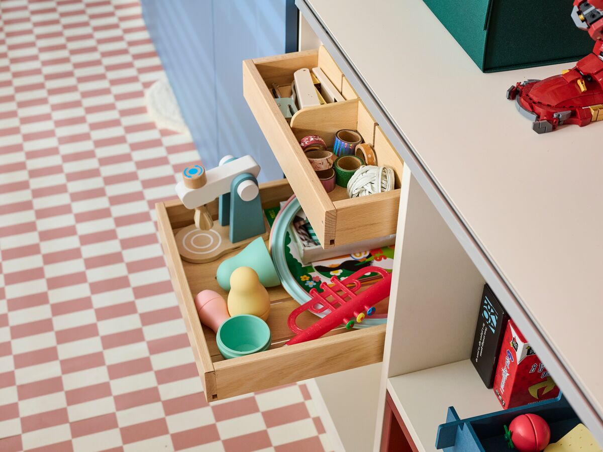 Enfin, des clayettes spécialement conçues permettent également de ranger les jouets des enfants, favoriser leur autonomie et protéger les pieds des parents. Ces fonctionnalités intelligentes rendent la pièce sécurisée, tout en optimisant chaque centimètre de l’espace disponible.