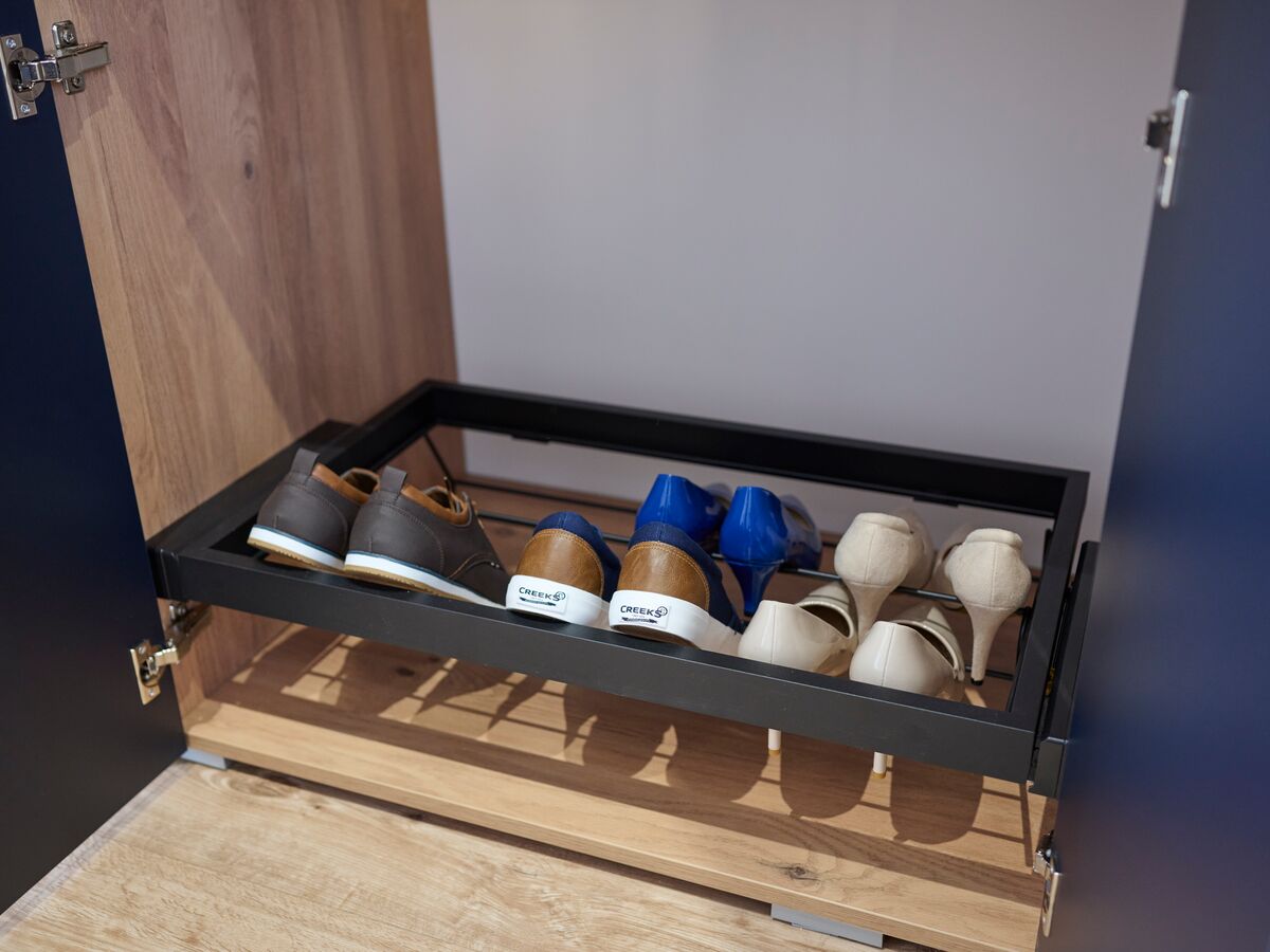 Au cœur de ce dressing bleu, une niche centrale fait office de coiffeuse, créant un espace personnel élégant où miroir et éclairage LED se conjuguent pour un confort optimal. Les étagères ajustables et les range-chaussures coulissants transforment le rangement en un véritable jeu d'enfant, accueillant jusqu'à 8 paires dans un système aussi pratique qu'esthétique.