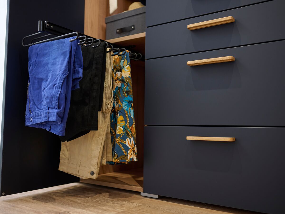 Chaque détail a été pensé pour faciliter votre quotidien : le support pantalons coulissant préserve impeccablement vos vêtements, les armoires intègrent des solutions d'éclairage intelligentes, et les poignées ergonomiques s'accordent parfaitement avec le design épuré de l'ensemble.