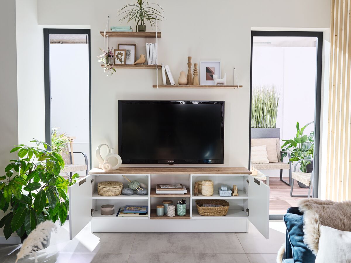 Un meuble télé bas vous laisse également tout le loisir d’ajouter des étagères murales en hauteur, afin que les solutions de rangement s’inscrivent avec légèreté dans votre agencement intérieur. Il ne vous restera plus qu’à choisir bougies et plantes vertes pour en faire un meuble au cœur de la tendance.