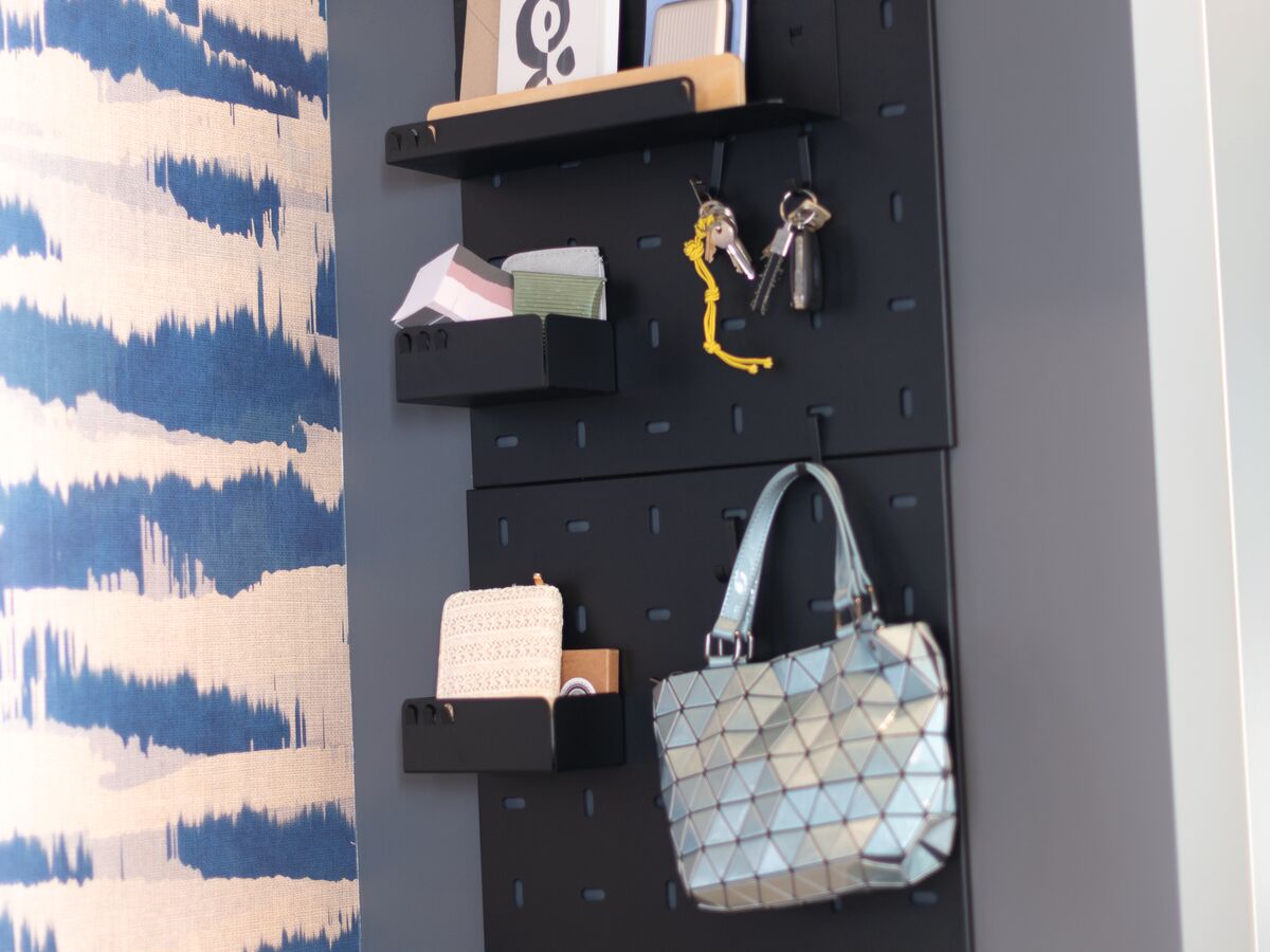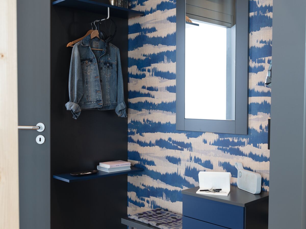 L’espace est optimisé au maximum et il n’y a pas de couloir. Une fois la porte d’entrée franchie, vous arrivez donc directement dans la pièce de vie, mais les espaces sont tout de même délimités grâce à une cloison faite avec des planches de bois clair. Ce matériau naturel et épuré se marie d’ailleurs à merveille avec le style minimaliste de l’entrée. Entre le miroir, le petit banc, le portant et la penderie aux portes coulissantes, vous entrez dans un univers cocooning dès votre arrivée.