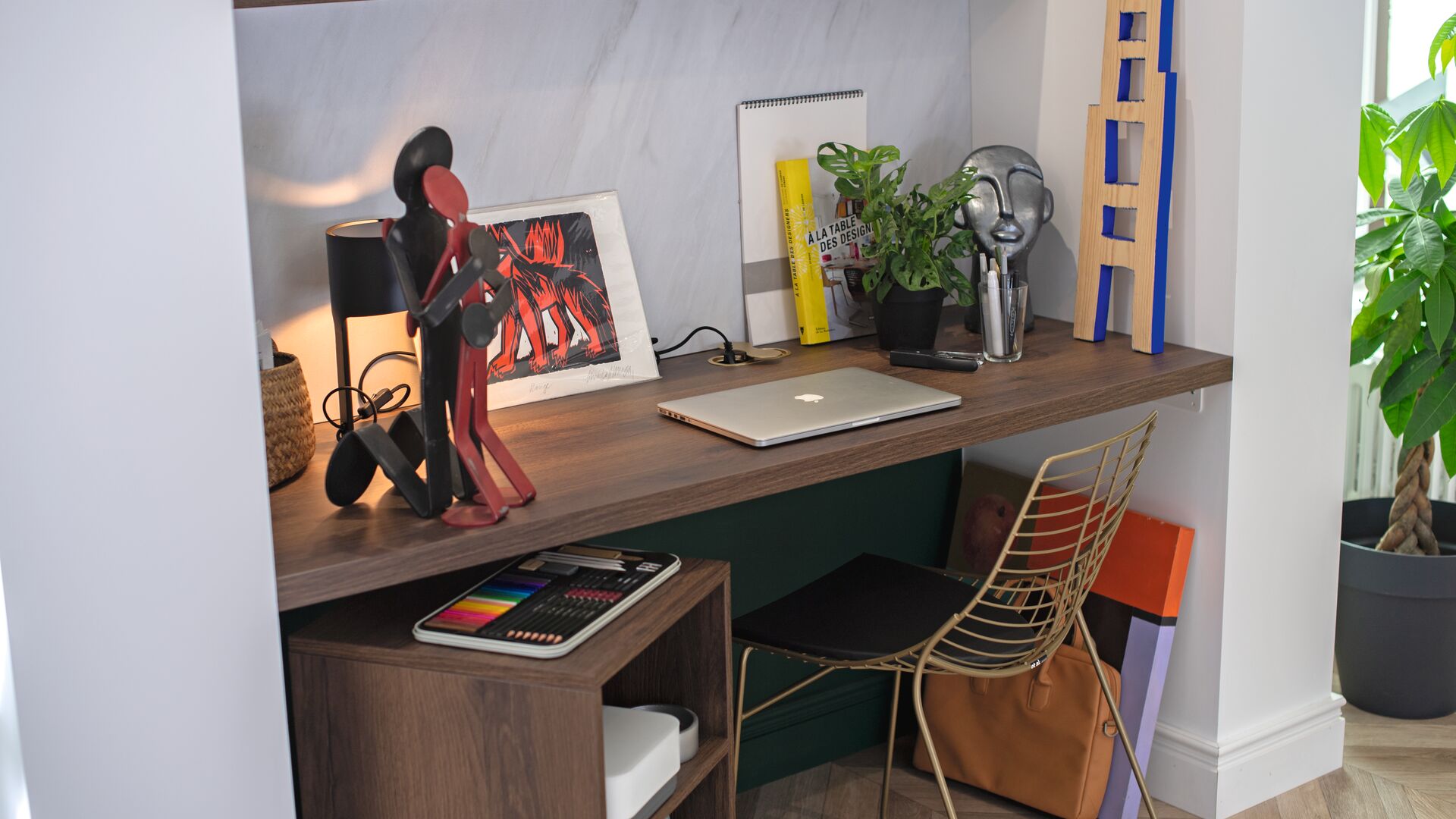En combinant aspect pratique et recherche esthétique, tout a ainsi été imaginé pour pouvoir adapter ce coin télétravail sur mesure, entre murs, à la pièce. Pour que travailler soit aussi un plaisir !