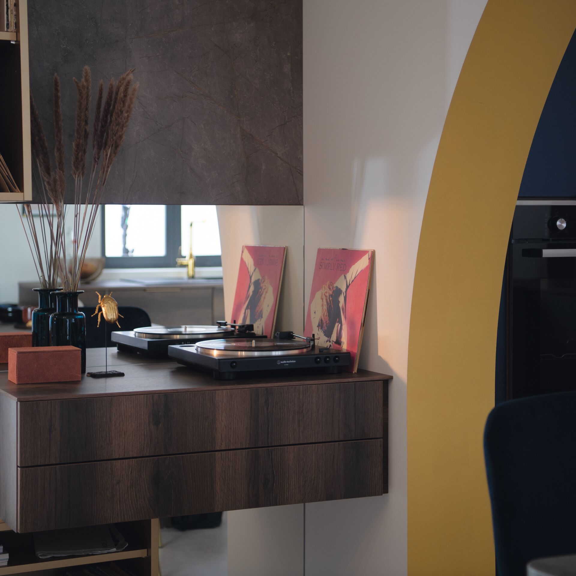 Chez moi, le vintage est mis à l’honneur, la déco des années 70 est actualisée avec les tendances actuelles : bois foncé, lignes arrondies, touches dorées… La part belle est faite à des objets iconiques chinés, des décorations artisanales. Ma platine et mes vinyles ont leur propre meuble de rangement.